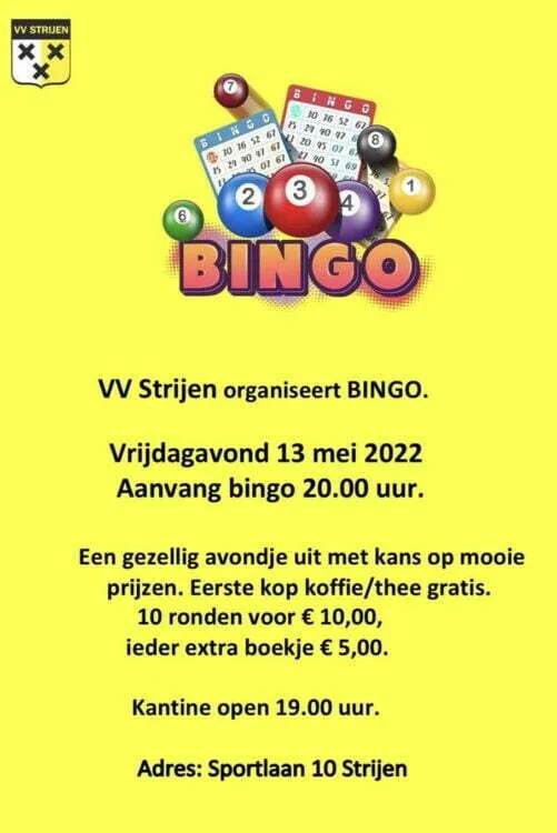 VV Strijen organiseert op vrijdagavond 13 mei weer een BINGO.