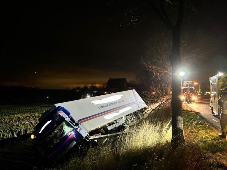 Vrachtwagen belandt op z’n kant in de sloot in Klaaswaal