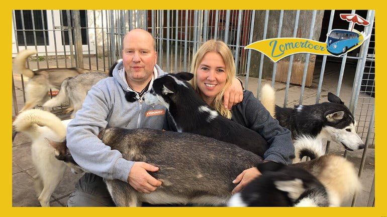 Verslaggever volledig bedolven onder de prijswinnende huskies van Roderick Glastra en Anita van Steijn uit Numansdorp