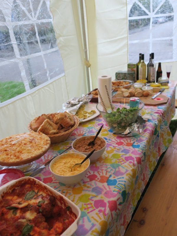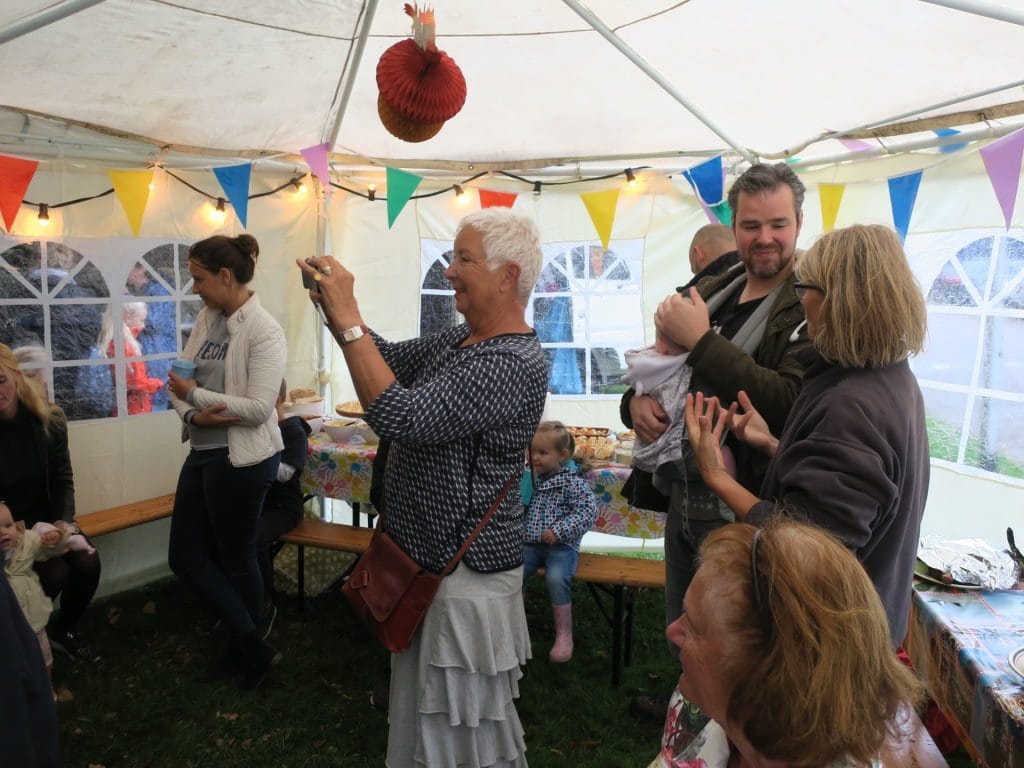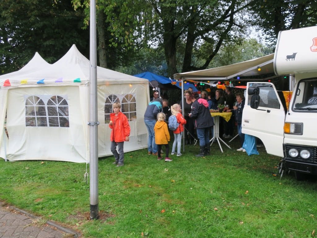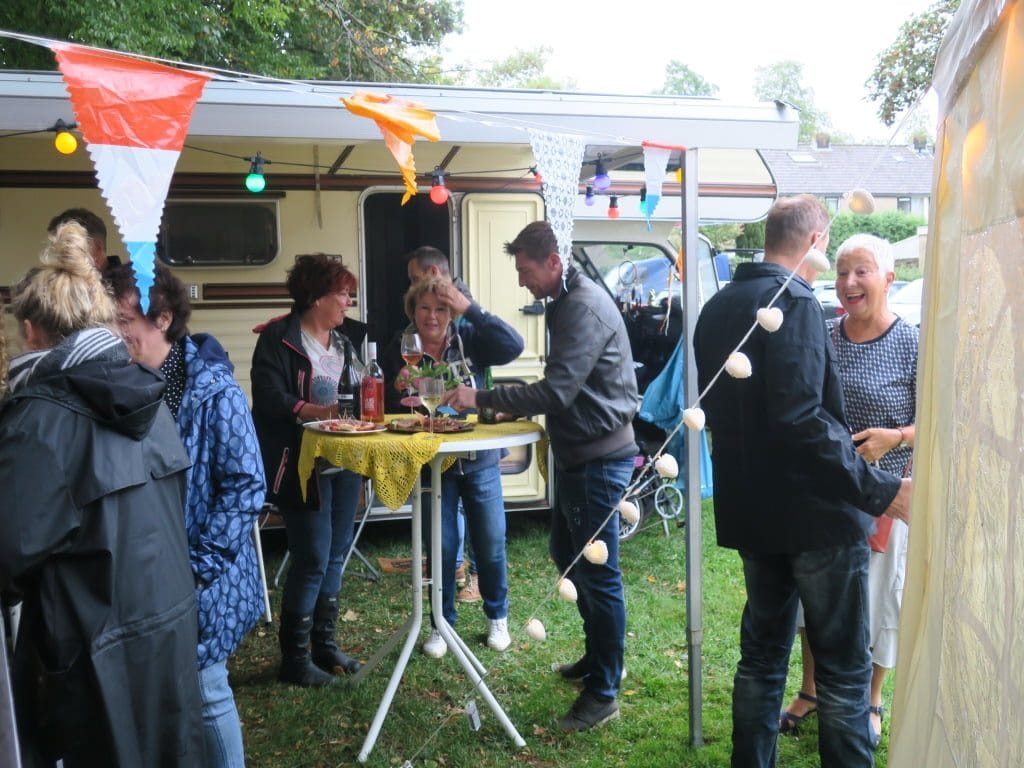Via de moderne media waren de buurtbewoners geïnformeerd.Spontaan melden zich de broodnodige vrijwilligers.Er kwam een grote feesttent met een overkapping naar “plork” een nostalgische camper. Dit alles feestelijk gedecoreerd en verlicht. Er kwamen bartafels, banken, klapstoelen en lange tafels waarop iedere bewoner zijn meegebracht gerecht kon neerzetten. Een cateraar zou jaloers zijn op de heerlijke warme- en koude gerechten. Iedereen werd eveneens verzocht om zijn eigen bord, bestek, glas en drank mee te nemen om zo min mogelijk plastic afval te creëren.