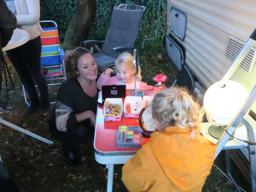 Gezellige achtergrond muziek, overstemde de regen. Voor de kinderen was er een sjoelbak, grimeer- en een make-up hoekje waar dankbaar gebruik van werd gemaakt. De camper bood plaats aan baby en kinderoppas.