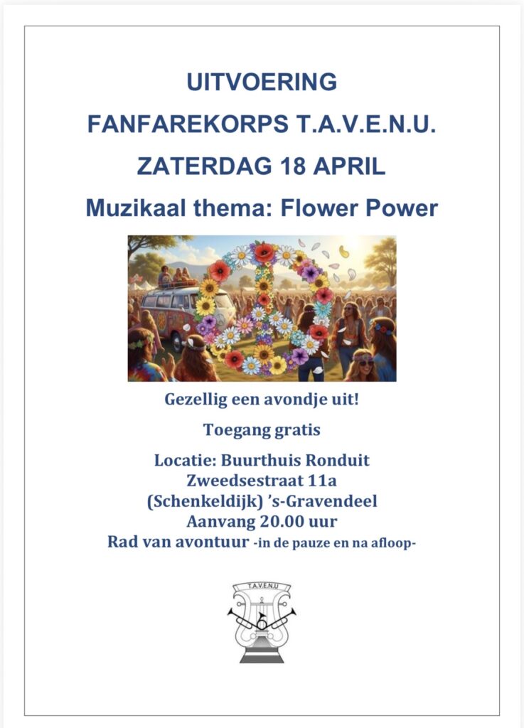 Enkele dagen eerder, op zaterdag 18 april, organiseert T.A.V.E.N.U. haar jaarlijkse uitvoering. Dit jaar staat de avond in het teken van het muzikale thema “Flower Power”, met herkenbare muziek uit de jaren ’70.