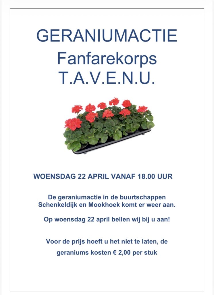 Op woensdag 22 april gaan leden van het fanfarekorps vanaf 18.00 uur langs de deuren in de buurtschappen Schenkeldijk en Mookhoek. Inwoners kunnen kiezen uit verschillende soorten en kleuren geraniums, die voor €2,00 per stuk aan huis worden geleverd.