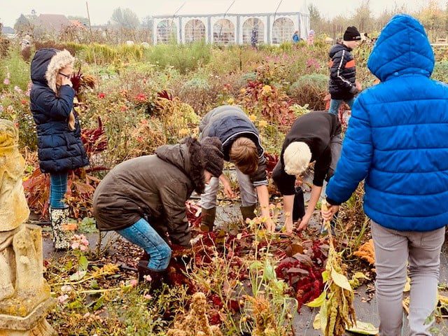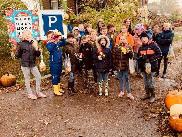 Energiek werden de eenjarigen uit de grond getrokken zodat die compost kunnen worden. Er werd echt hard gewerkt, een groot gedeelte van de pluktuin is was al kaal voor de officiële natuurwerkdag voor volwassenen op zaterdag. Na de gedane arbeid mochten er als dank nog wat overgebleven bloemen en stoofpeertjes geplukt worden. Met de handen vol en na een laatste foto liepen de kinderen met rode wangen terug naar school nadat ze beloofd hadden volgend jaar weer terug te zullen komen.