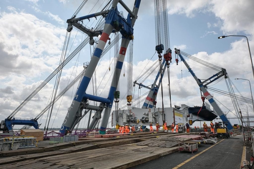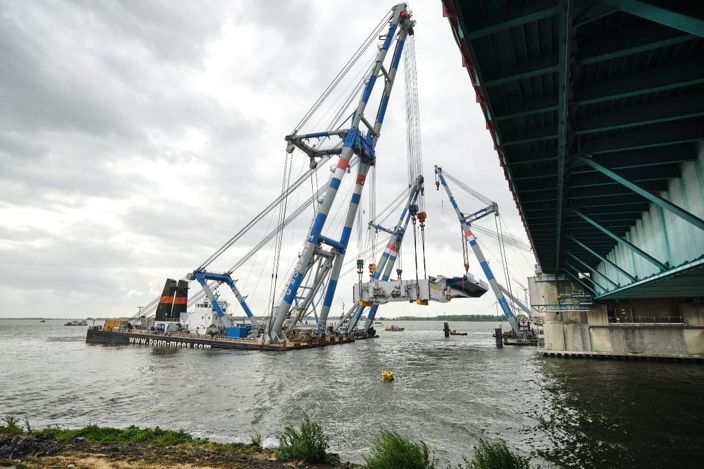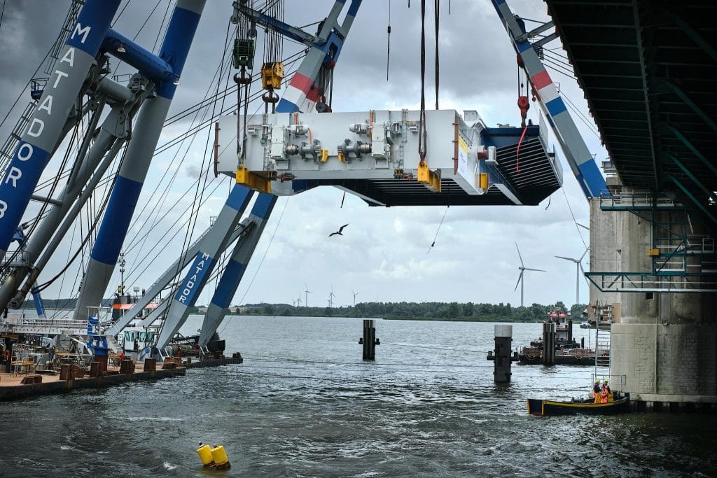 Naast dat het een imposante hijsklus was vanwege het enorme gewicht, was het ook nog een precisieklus. De brugklep moest namelijk tot op de millimeter nauwkeurig over de tandbaan worden geplaatst.