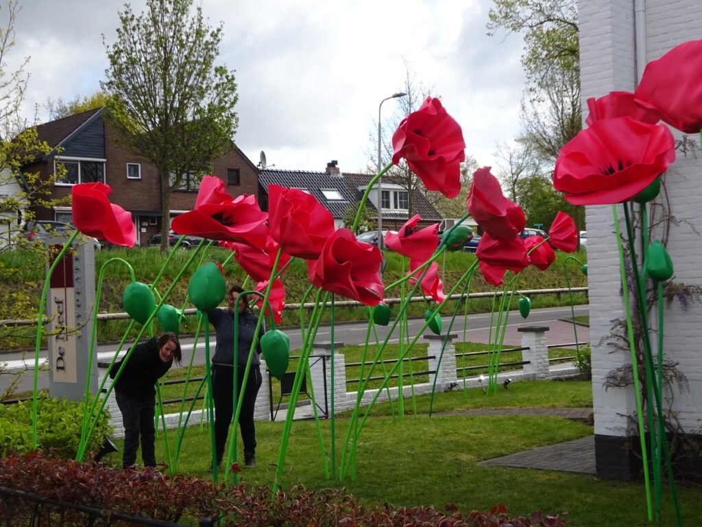 Oud-Beijerland – Heb jij ze al gespot de 100 klaprozen van ca. 3 meter hoog bij de rotonde, bij het kantoor van de Neef Advocaten aan de Beneden Oostdijk in Oud-Beijerland? Kees Walpot van het bedrijf Big Flower uit Klaaswaal fleurde vandaag met de klaprozen de boel op in Oud-Beijerland.