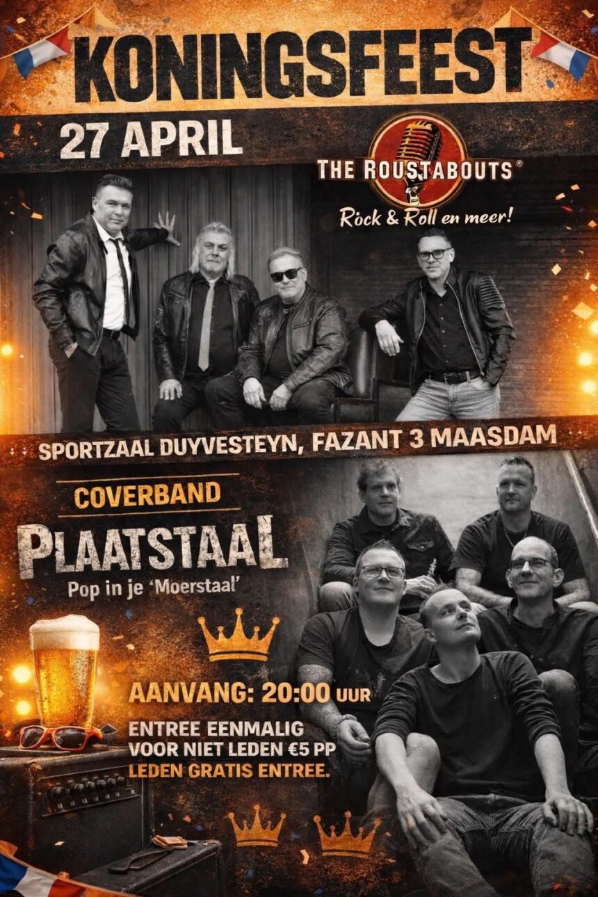 Na de dagfestiviteiten in en rondom sportzaal Duyvesteyn in Maasdam start vanaf 20:00 uur de Koningsfeestavond met optredens van maar liefst 2 bands met ieder hun eigen repertoir.Maak je klaar voor een avond vol energie, nostalgie en pure Rock ’n Roll in sportzaal Duyvesteyn in Maasdam.