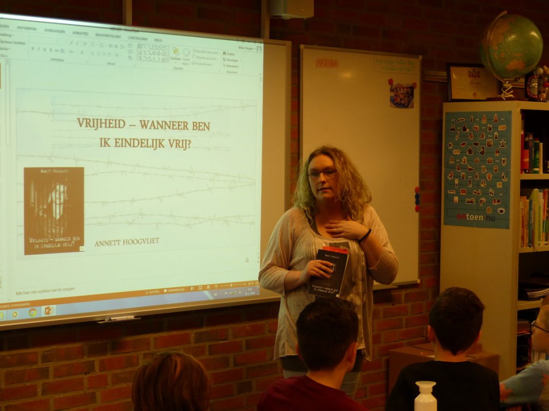 Annett las voor, vertelde haar levensverhaal en ging met de kinderen in gesprek; over vrijheid, vrije meningsuiting, zelf keuzes kunnen maken in het leven (zoals een volgende school), het werk kunnen doen wat je zou willen, etc.