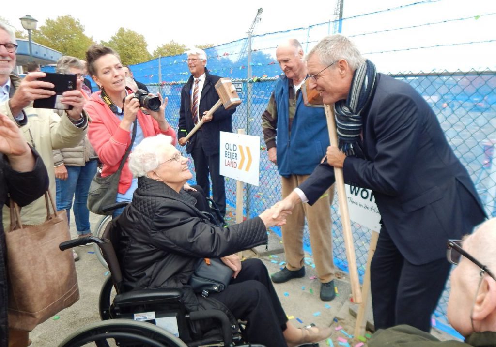OUD-BEIJERLAND – Een feestelijke middag afgelopen donderdag 27 oktober, vooral voor de toekomstige bewoners van de nieuwe Open Waard, want pal naast de bouwlocatie van het nieuw te bouwen woon-zorgcomplex werden de symbolische ‘eerste palen’ geslagen. Hiermee werd de start van de nieuwbouw officieel gemarkeerd. Geholpen door wethouder Van Leenen, Trix van Os van Alerimus, Jeremy Mans namens Groepscare, Petra van Petra’s Hairline en Ben Pluimer van HW Wonen, sloegen bewoners van de Open Waard vijf kleine paaltjes de grond in.