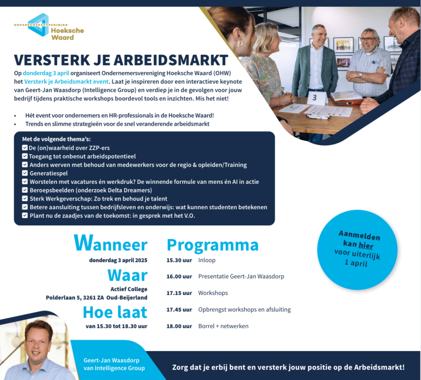 Op 3 april organiseert de Commissie Arbeidsmarkt en Onderwijs van Ondernemersvereniging Hoeksche Waard (OHW) samen met SOB-HW een bijeenkomst over de veranderende arbeidsmarkt.