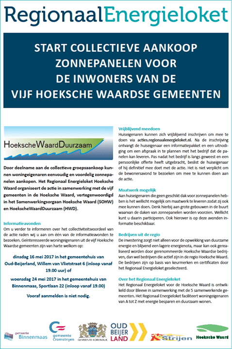 HOEKSCHE WAARD - Door deelname aan de collectieve groepsaankoop die half mei start kunnen woningeigenaren eenvoudig en voordelig zonnepanelen aankopen. Het Regionaal Energieloket Hoeksche Waard organiseert de actie in samenwerking…