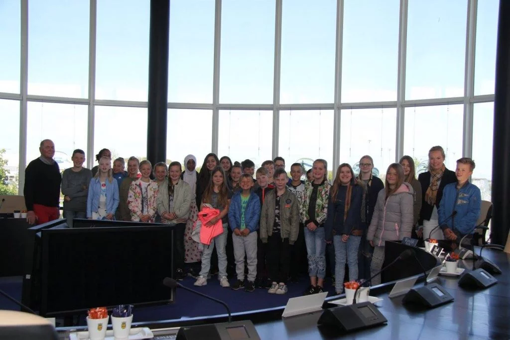 Leerlingen OBS De Driespan uit Puttershoek op bezoek in de raadzaal van het Gemeentehuis in Maasdam