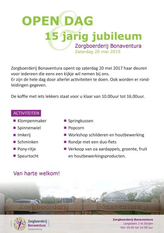 STRIJEN - Zaterdag 20 mei houd zorgboerderij Bonaventura in Strijen een open dag. Iedereen is van harte welkom om een kijkje te komen nemen! Wij bieden dagbesteding aan mensen met…