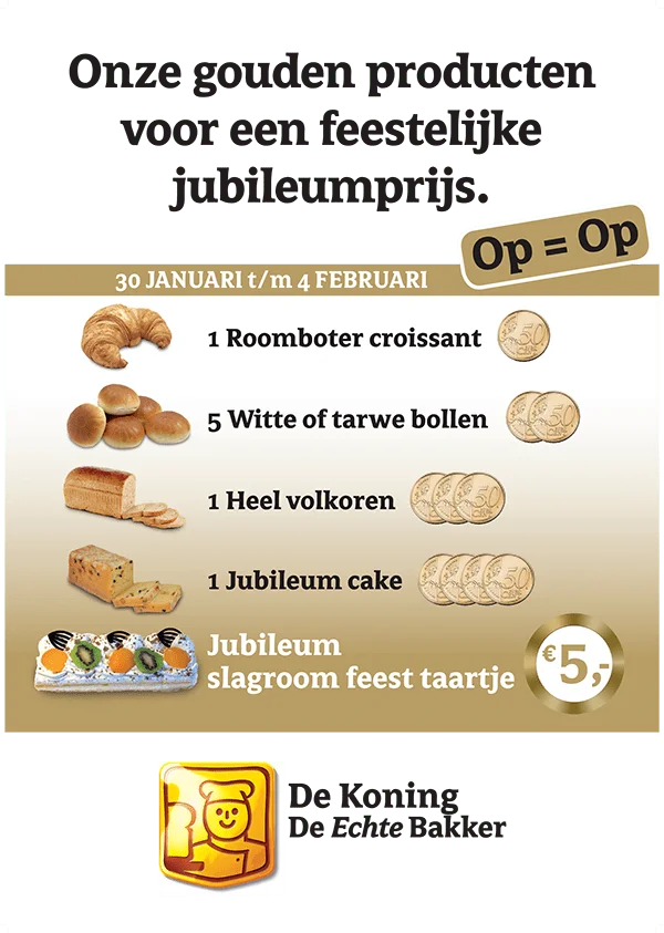 De gouden producten van Echte Bakker de Koning voor een feestelijke jubileumprijs! De Koning, De Echte Bakker Winkel Puttershoek: Oranjeplein 14 3297CV Puttershoek Tel. 078-6761938 Fax.078-6766782 Website: www.bakkerijdekoning.nl E-mail: [email protected] Winkel…