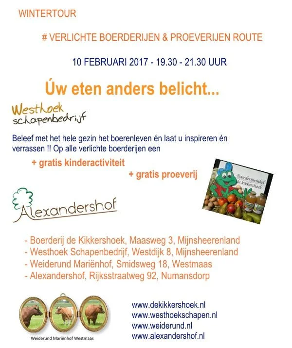 HOEKSCHE WAARD - Vrijdagavond 10 februari is de eerste WinterTour langs de Boer. Een avond waarop de herkomst van uw dagelijkse voedsel anders belicht wordt. De deelnemende boerderijen zullen verlicht…