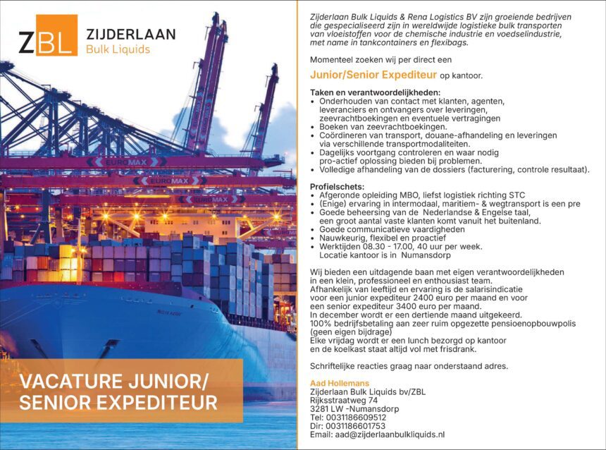 Vacature: Junior/Senior Expediteur bij Zijderlaan Bulk Liquids
