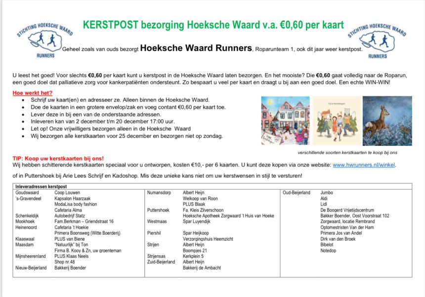 Ook dit jaar brengen de Hoeksche Waard Runners de kerstpost rond binnen de Hoeksche Waard, en dat voor slechts €0,60 per kaart. Een voordelige én mooie manier om kerstgroeten te…