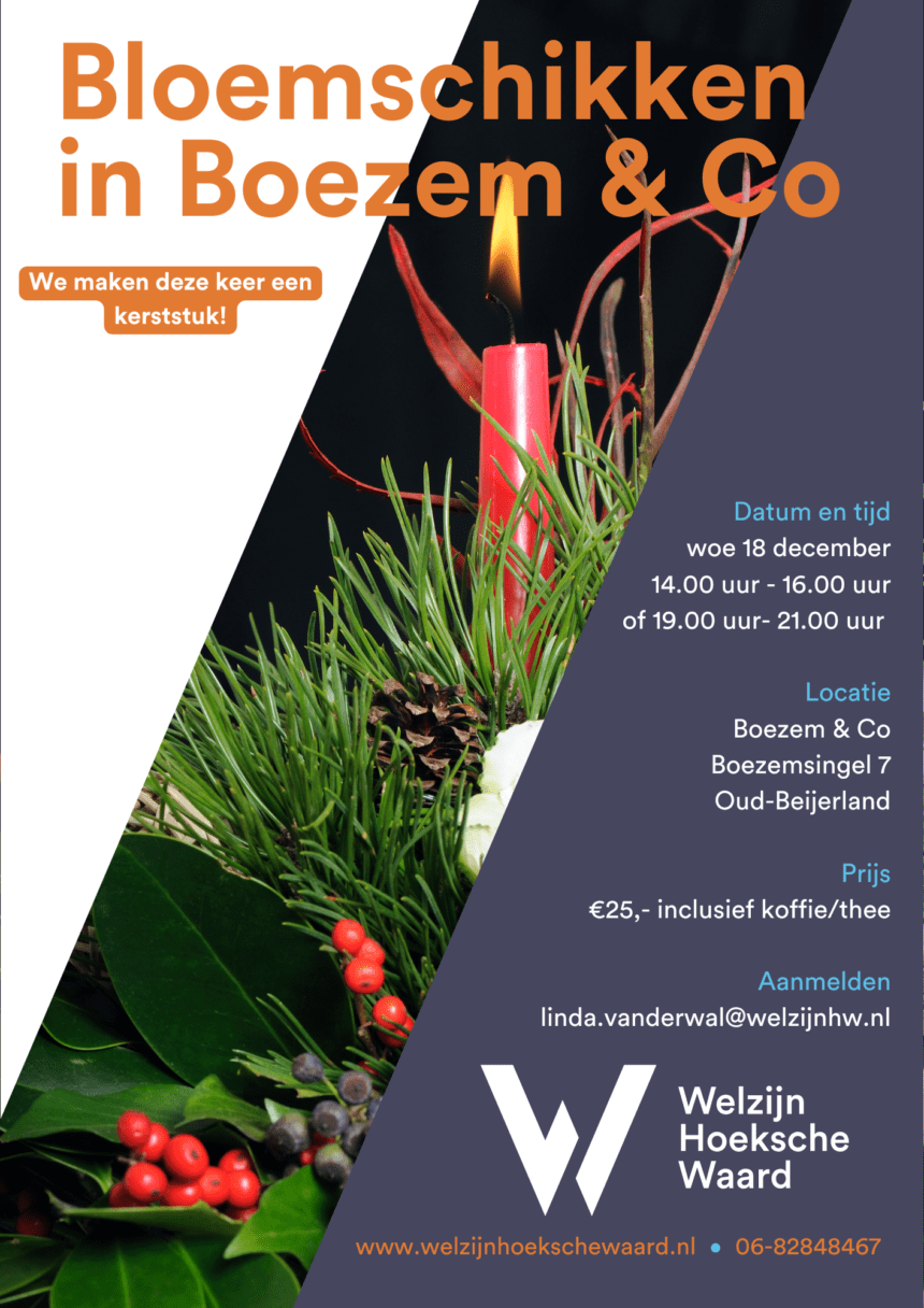 Houdt u ook zo van de kerst? Gezelligheid, lichtjes en natuurlijk kerststukjes! In Boezem maken we 18 december mooie grote kerstukken in glazen vazen of op kandelaars en natuurlijk genieten…