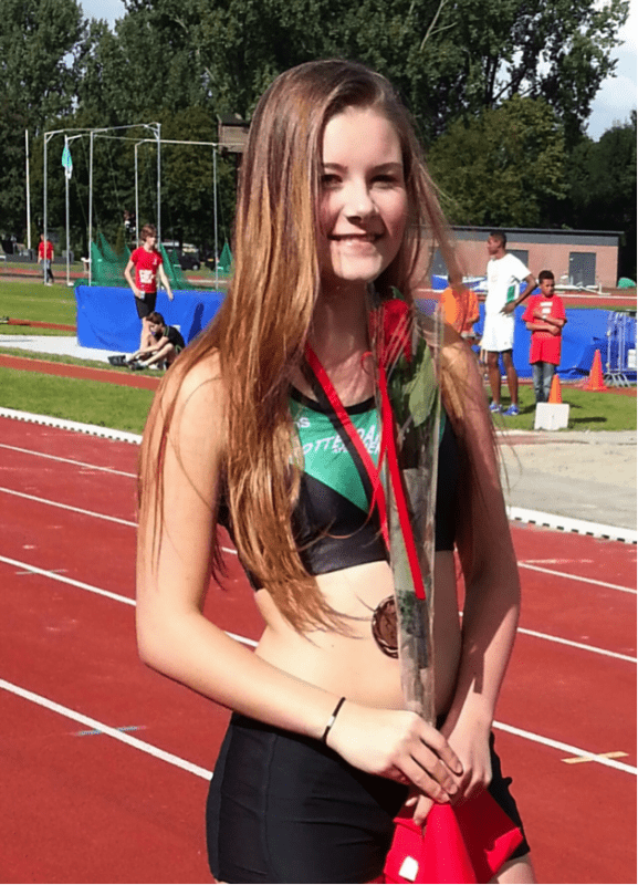 Brons voor Stella Bolderheij uit Strijen tijdens het C spelen Atletiek onderdeel Hinkstapspringen in Amsterdam