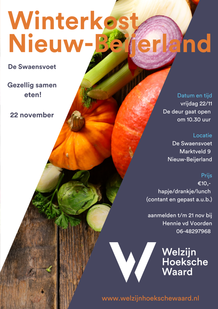 Vrijdag 22 november is er weer een gezellige Winterkost in de Swaensvoet in Nieuw-Beijerland. Deze activiteit wordt georganiseerd door een groep enthousiaste vrijwilligers van Welzijn Hoeksche Waard. U bent vanaf…