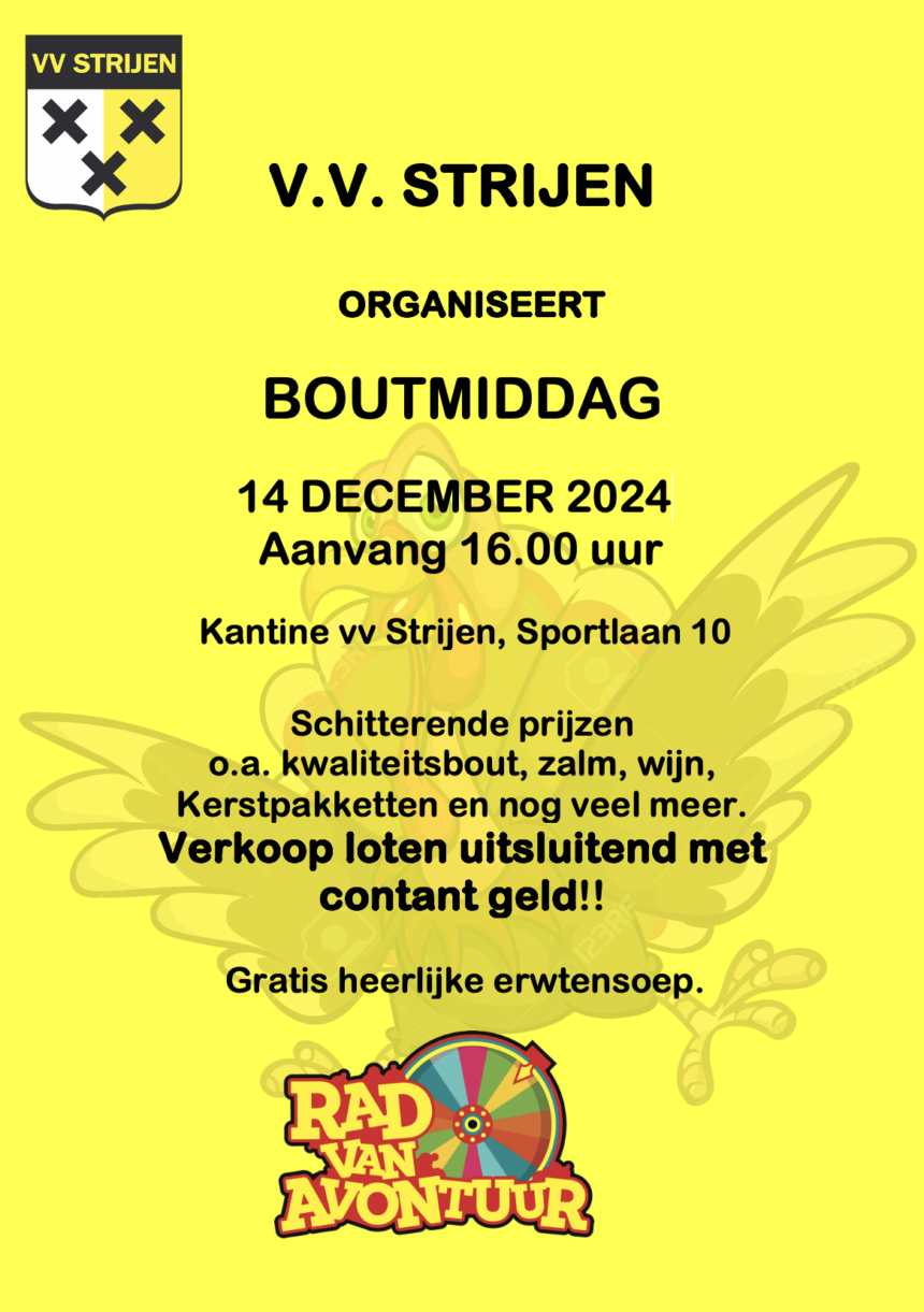 Strijen– Op zaterdag 14 december organiseert voetbalvereniging V.V. Strijen de traditionele Boutmiddag, een geliefd evenement waarbij bezoekers kans maken op fantastische prijzen en kunnen genieten van de gezellige kerstsfeer. Het…