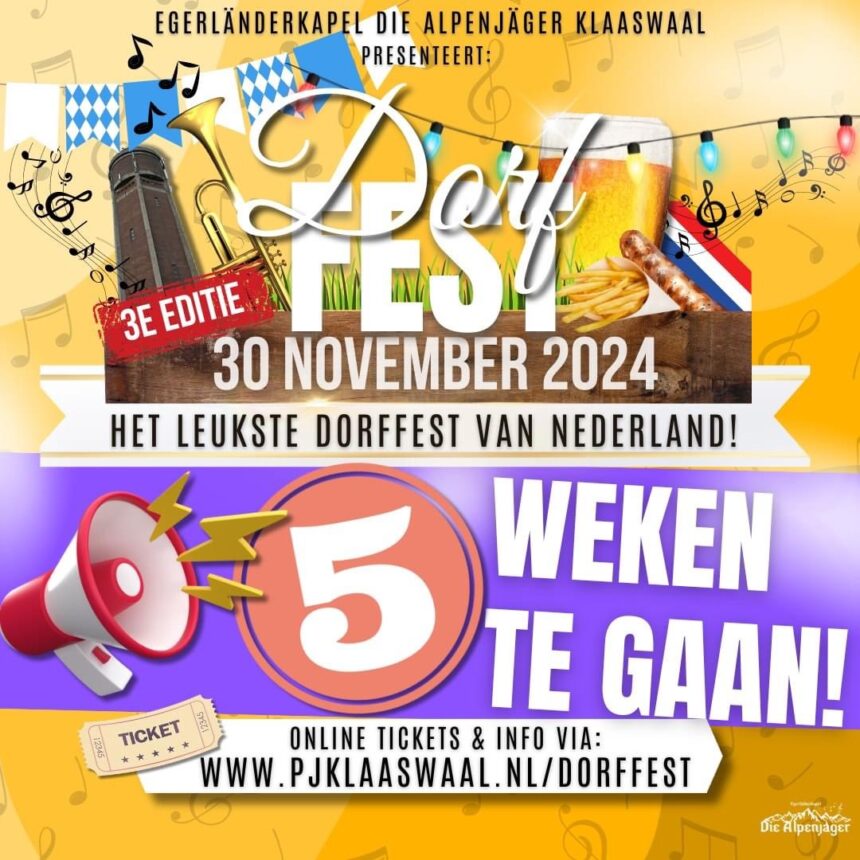 Het aftellen is begonnen. Nog maar 𝟓 𝐖𝐄𝐊𝐄𝐍 tot het ‘𝐋𝐞𝐮𝐤𝐬𝐭𝐞 𝐃𝐨𝐫𝐟𝐟𝐞𝐬𝐭 𝐯𝐚𝐧 Klaaswaal’ 🎉 Bereid je voor op een avond vol sfeer, muziek, en gezelligheid in Duitse stijl! 🍺🎶