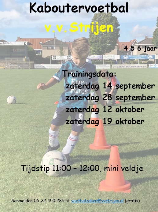 Voetbalvereniging v.v. Strijen organiseert deze herfst Kaboutervoetbal voor kinderen van 4, 5 en 6 jaar. Dit initiatief biedt jonge kinderen de kans om spelenderwijs kennis te maken met voetbal.