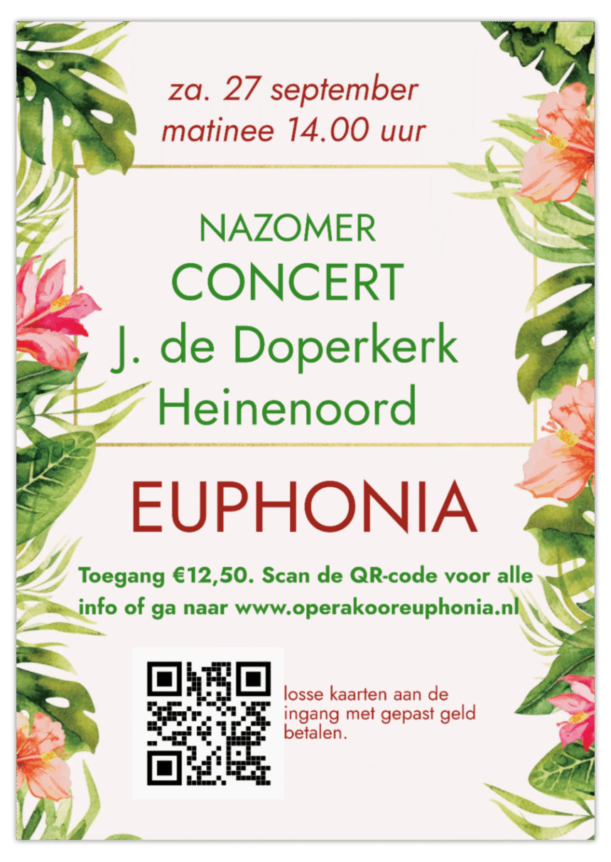 Op zaterdagmiddag 27 september geeft het koor Euphonia uit Oud-Beijerland een matineeconcert. Een prima manier om kennis te maken met het koor en het repertoire van dit koor. Op de…