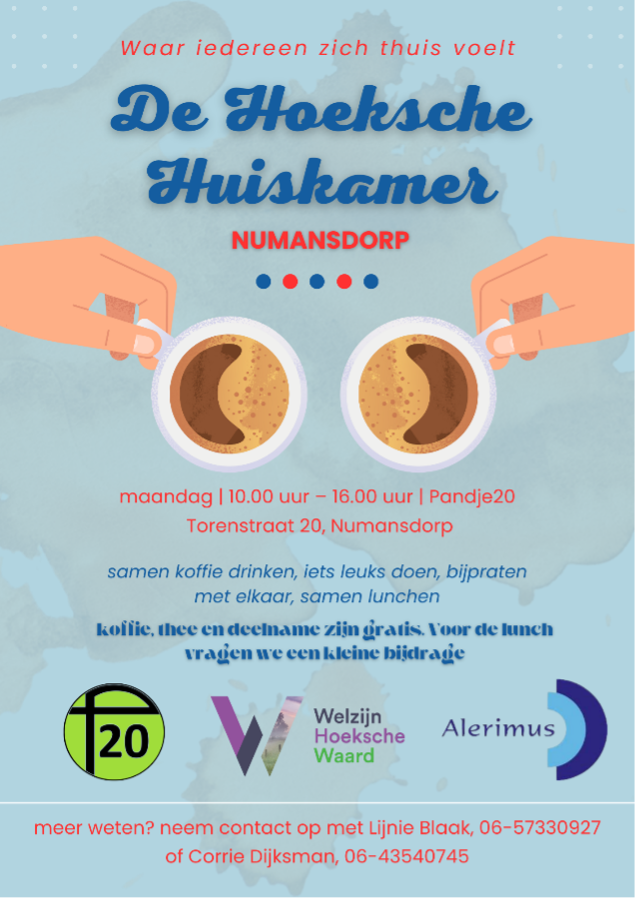 Samen koffie drinken, iets leuks doen, bijpraten met elkaar, samen lunchen. Dat is een greep uit wat er gebeurt op een dag in de Hoeksche Huiskamer die op maandagen georganiseerd…
