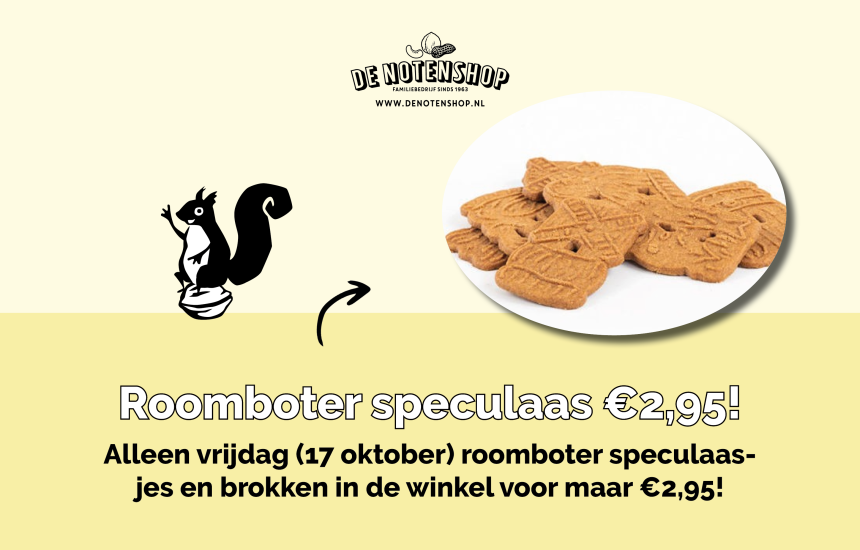 Zin in een knapperige snack? Kom dan vrijdag 17 oktober naar de winkel van De Notenshop. De overheerlijke roomboter speculaasjes en speculaasbrokken scoor je alleen deze vrijdag voor maar €2,95!