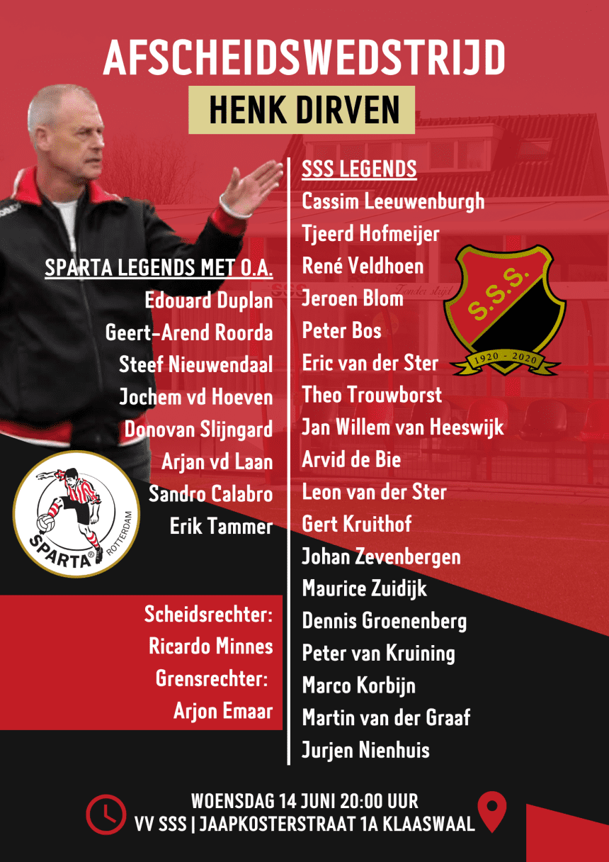 Afscheidswedstrijd Henk Dirven woensdag 14 juni met Sparta Legends bij SSS