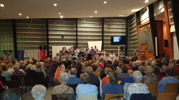 Feest in de kerkzaal van de Open Hof tijdens het concert van Shanty Koor de Hoeksche Waard