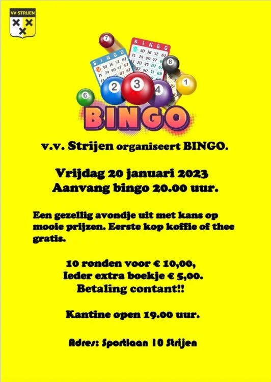 Vrijdagavond 20 januari organiseert de v.v. Strijen weer een BINGO. Aanvang bingo 20.00 uur.