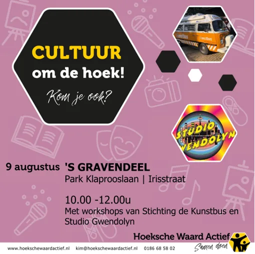 Hoeksche Waard Actief organiseert op dinsdag 9 augustus tussen 10.00 - 12.00u, Cultuur om de Hoek in ‘s Gravendeel. Cultuur om de Hoek laat kinderen laagdrempelig kennis maken met verschillende…