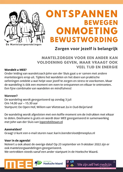 Op zondagmiddag 3 juli organiseert MEE Mantelzorg samen wandelcoach John van der Sluis de tweede Mantelzorg Wandeling.