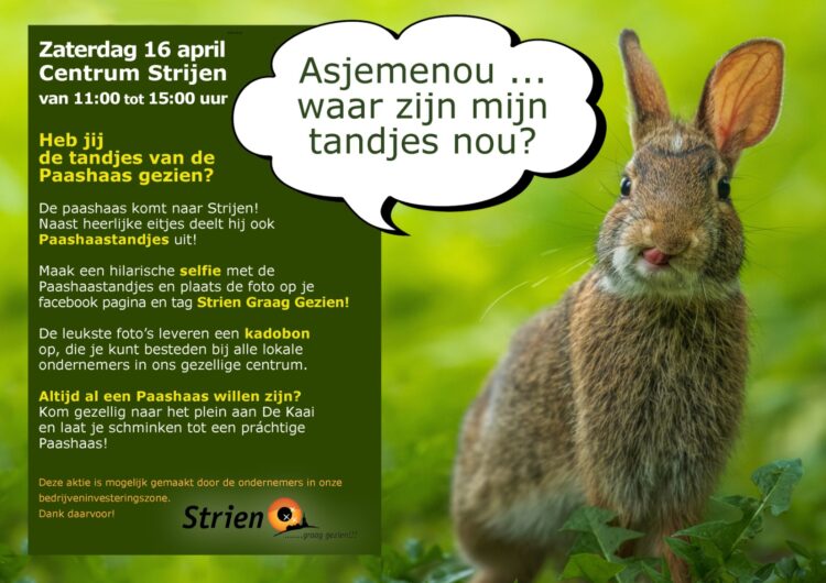 De paashaas komt op zaterdag 16 april tussen 11.00 uur en 15.00 uur naar het centrum van Strijen! Naast heerlijke eitjes deelt hij ook Paashaastandjes uit!
