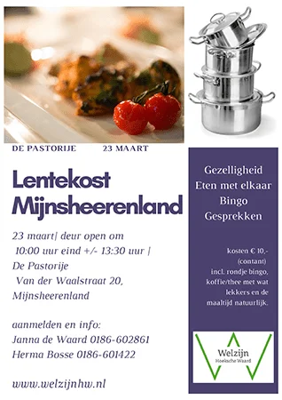 Mijnsheerenland - Woensdag 23 maart is er weer Lentekost in de Pastorije, van der Waalstraat 20, in Mijnsheerenland. Deze activiteit wordt georganiseerd door een groep enthousiaste vrijwilligers van Welzijn Hoeksche…