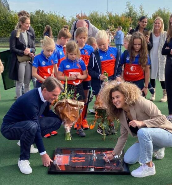 Hockeyinternational Maria Verschoor en wethouder Boogaard openen het nieuwe hockeyveld in Mijnsheerenland