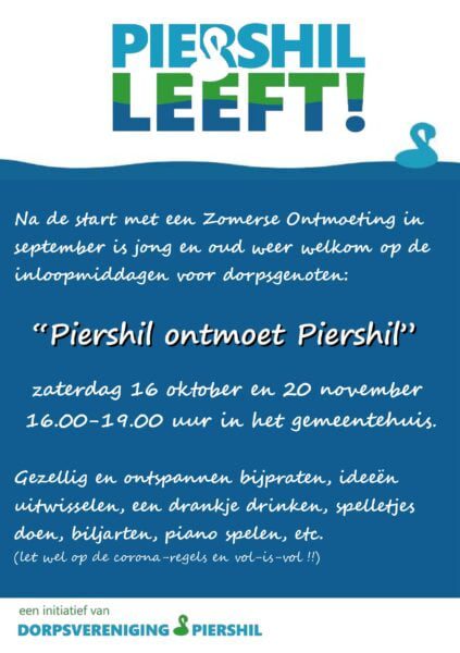 Piershil - Op zaterdag 16 oktober en 20 november tussen 16.00 en 19.00 uur organiseert de dorpsvereniging Piershil inloopmiddagen.Iedereen is van harte welkom voor een drankje te drinken, praatje te maken of een…