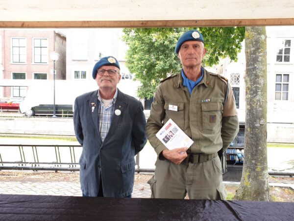 Veteranen Aloys Bijl en Dominic Hoogsteder van het Veteranen Comité Hoeksche Waard op de Oud-Beijerlandse woensdagmarkt