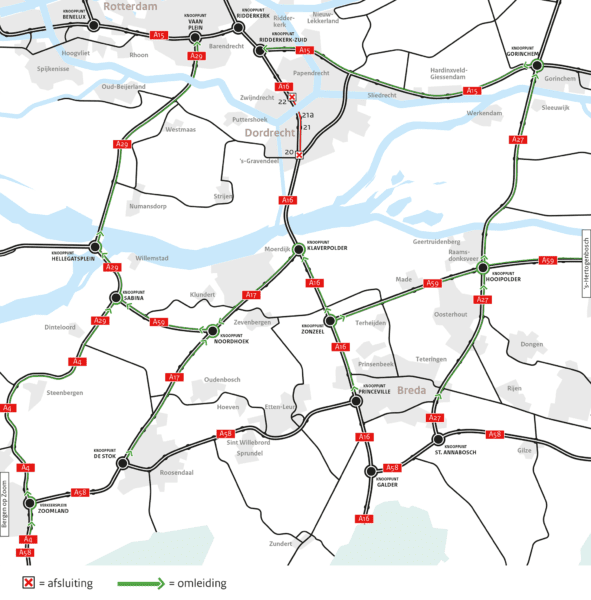 A16 tussen ’s Gravendeel en Zwijndrecht afgesloten van 17-19 juli 2021 (richting Rotterdam)