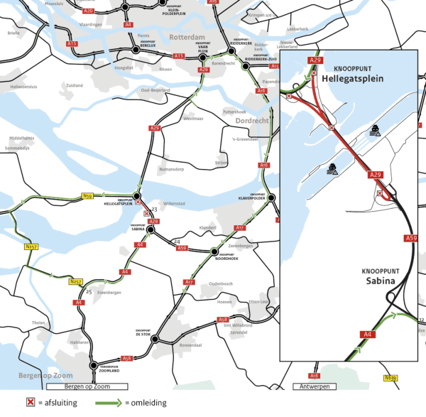 Van vrijdag 7 tot maandag 31 mei 2021 vindt er rond 4 opeenvolgende weekenden groot onderhoud plaats op de A29 richting Bergen op Zoom, tussen knooppunt Hellegatsplein en afrit Willemstad.