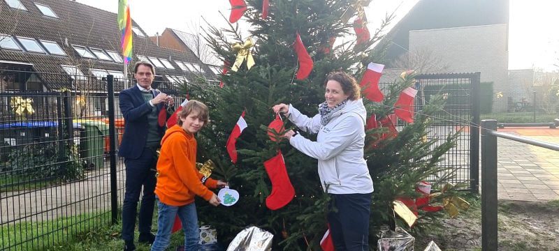Enorme kerstboom op het schoolplein van IKC de Wereld op Noord in Oud-Beijerland omgetoverd tot wensboom!