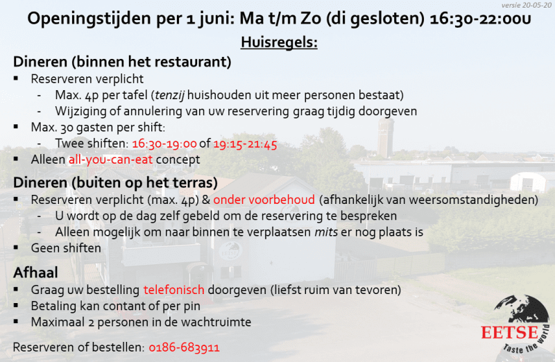 KLAASWAAL - Het is officieel! Per 1 juni mag restaurant Eetse Hoeksche Waard haar deuren weer openen! Zoals eerder aangekondigd hanteren wij een aantal huisregels (zie foto). We hebben de…