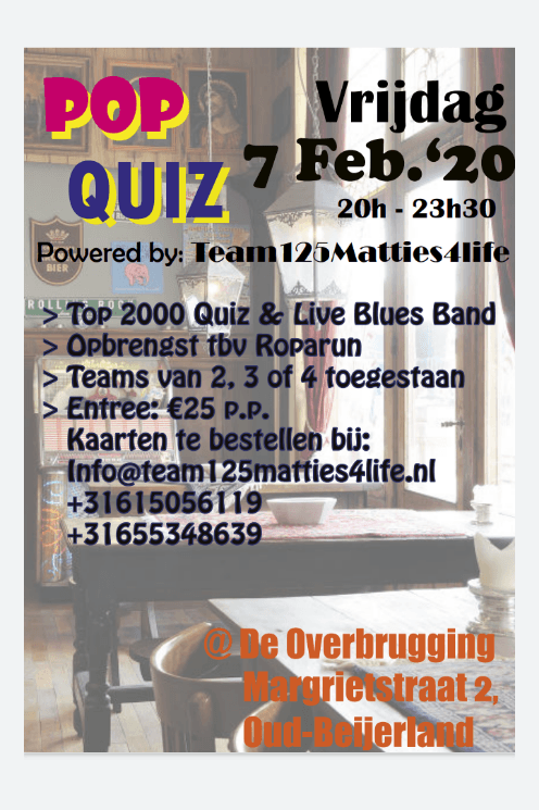 OUD-BEIJERLAND - Wil je een leuke avond met live muziek beleven én ook nog het goede doel de Roparun steunen. Doe dan op vrijdag 7 februari mee met de Top2000…