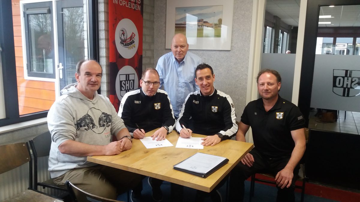 OUD-BEIJERLAND - Na afloop van de wedstrijd oefenwedstrijd SHO – Hellevoetsluis die SHO met 2 -1 won verlengden trainer Sander Fakkel en assistent Boudewijn de Jong hun verbintenis met SHO.