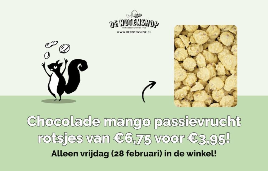 Op vrijdag 28 februari heeft De Notenshop in de winkel een onweerstaanbare aanbieding voor jou! De nieuwe ‘Chocolade mango passievrucht rotsjes’, een heerlijke combinatie van witte chocolade, zoete mango en…