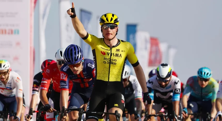 Olav Kooij heeft zijn eerste seizoenszege beet. De 23-jarige Nederlander sprintte in de openingsetappe van de vijfdaagse rittenkoers overtuigend naar de zege.