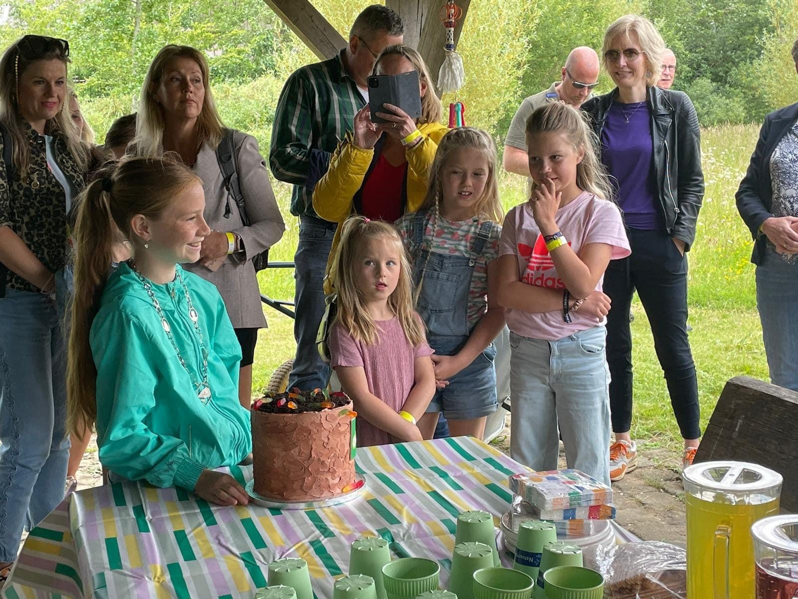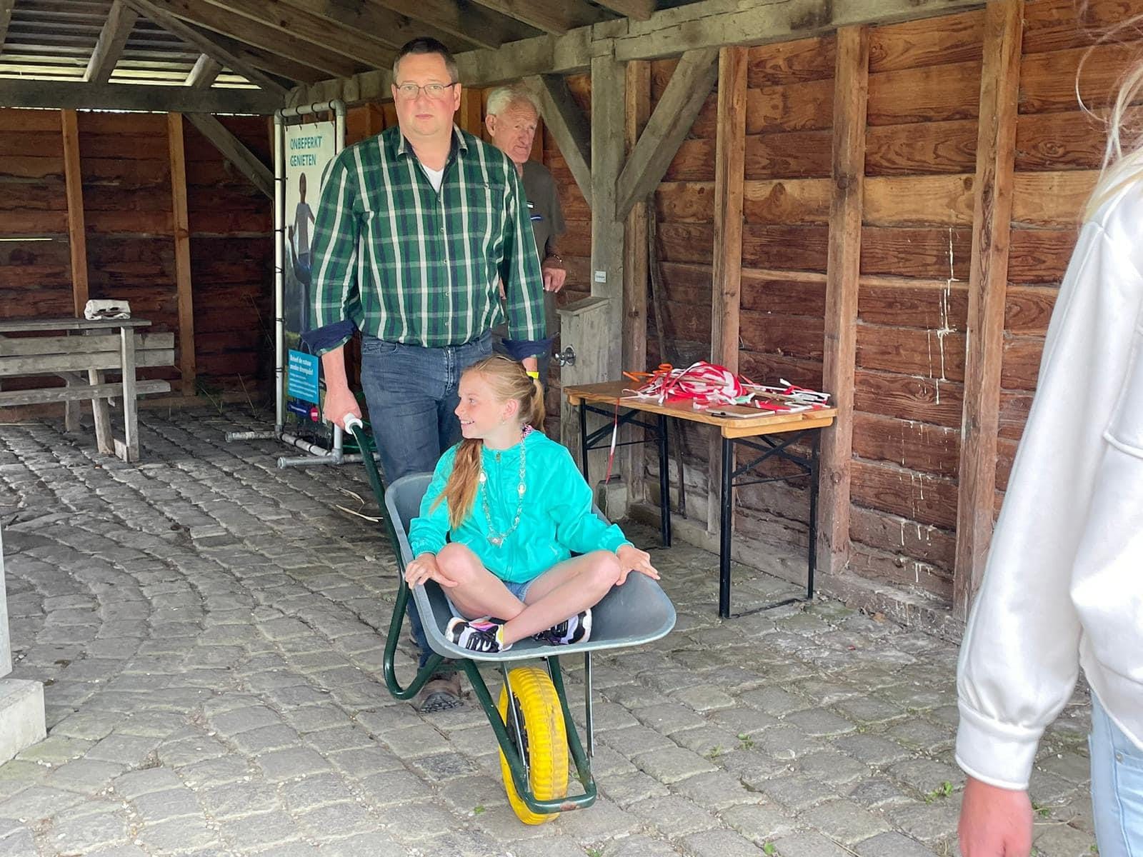In een nek aan nek race met de kruiwagen, mocht Babette als winnaar de feestelijke moddertaart aansnijden. Kinderen genoten van de speelnatuur en wie dat wilde, kreeg een rondleiding van vrijwilligers over het terrein.