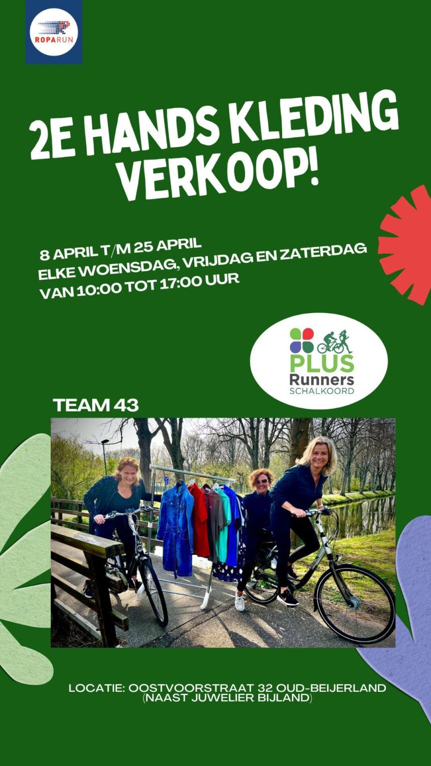 OUD-BEIJERLAND – Roparun Team 43, de Plusrunners Schalkoord, opent vanaf woensdag een tijdelijke tweedehands dameskledingwinkel in het centrum van Oud-Beijerland. De opbrengst komt ten goede aan het goede doel van de Roparun.